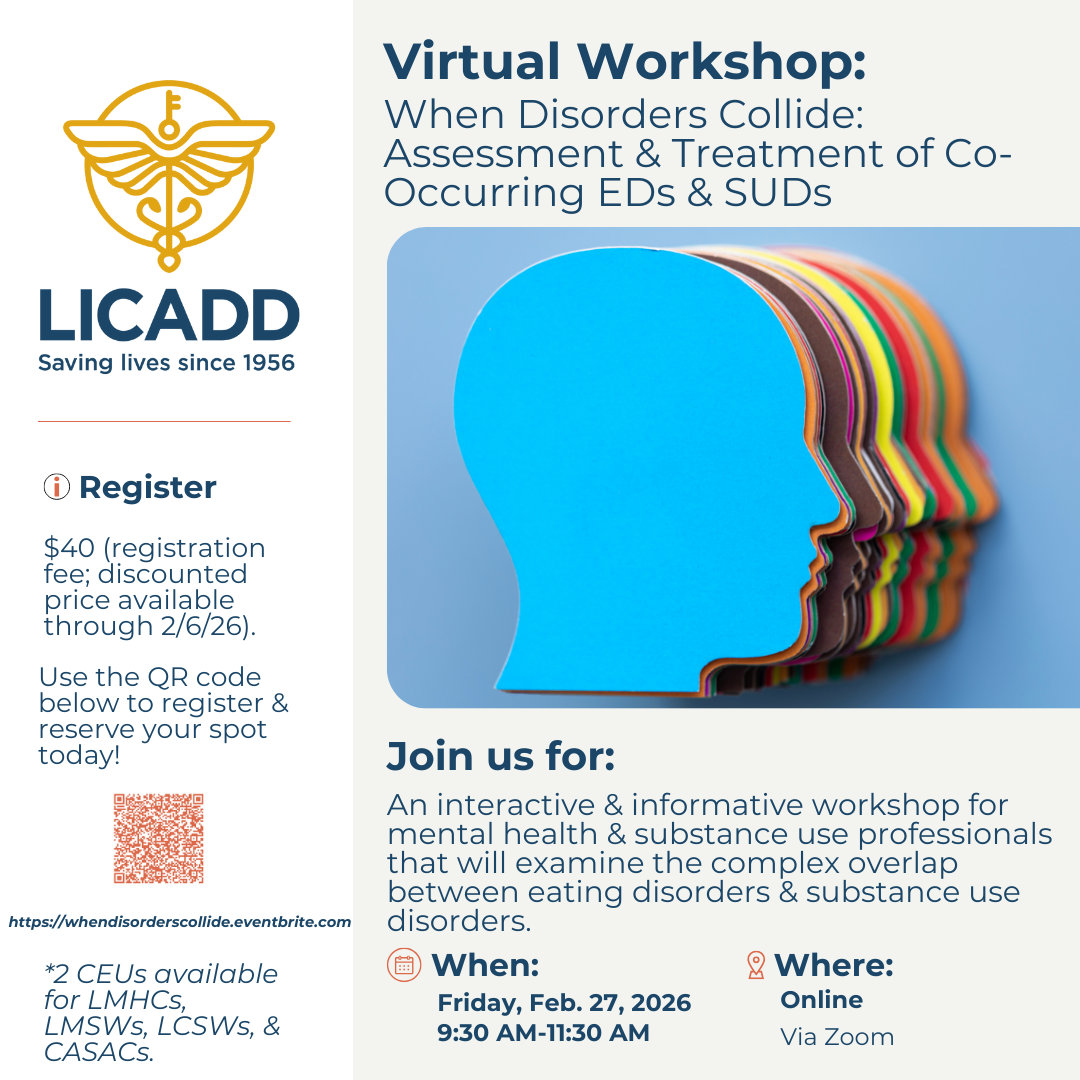 Info: Join LICADD for this virtual workshop during Eating Disorders Awareness Week (EDAW) that is designed to deepen participants understanding of the complex and often intertwined relationship between eating disorders (EDs) and substance use disorders (SUDs). This workshop will explore common clinical presentations, shared risk factors, overlapping neurobiological and psychological mechanisms, and common challenges in the identification and treatment of these co-occurring disorders.